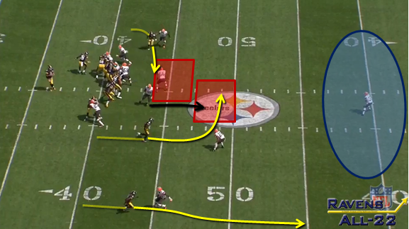 Since the Browns matched Karlos Dansby in man-coverage versus Jimmy Graham on a number of snaps, we can expect that Pitta will thrive in this mismatch as well. Fans have been clamoring to see Torrey Smith get the ball more often, but in this particular game, I think the prudent strategy would be to continue the approach from the Week 2 Steelers game and take advantage of underneath patterns (e.g. Y-Stick, Y-Arrow, F-Post/Texas, and Flanker Drive). These types of patterns put the coverage linebackers in a bind and allow the Ravens to stay ahead of the down. Third-and-longs are not a great situation for this Ravens offense, particularly against a team that doesn't hesitate to bring pressure.